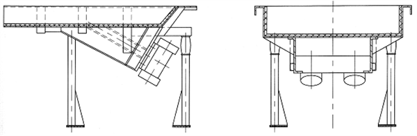 該系列給料機的給料過程是利用特制的振動電機或兩臺電動機帶動激振器驅(qū)動給料槽沿傾斜方向作周期直線往復(fù)振動來實現(xiàn),當給料槽振動的加速度垂直分量大于重力加速度時,槽中的料被拋起,并按照拋物線的軌跡向前跳躍運動,拋起和下落在瞬間完成,由于激振源的連續(xù)激振,給料槽連續(xù)振動,槽中的煤連續(xù)向前跳躍,以達到給料的目的。